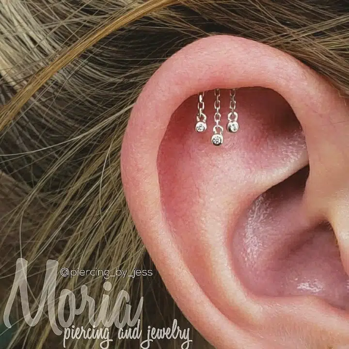 Een sierlijke gouden curve wordt verfraaid met drie fonkelende CZ-stenen, die met fijne kettinkjes zijn bevestigd. Dit zorgt voor extra beweging en een schitterend, veelzijdig lichtspel. Een stijlvol ontwerp dat direct in het oog springt en toch comfortabel te dragen is.